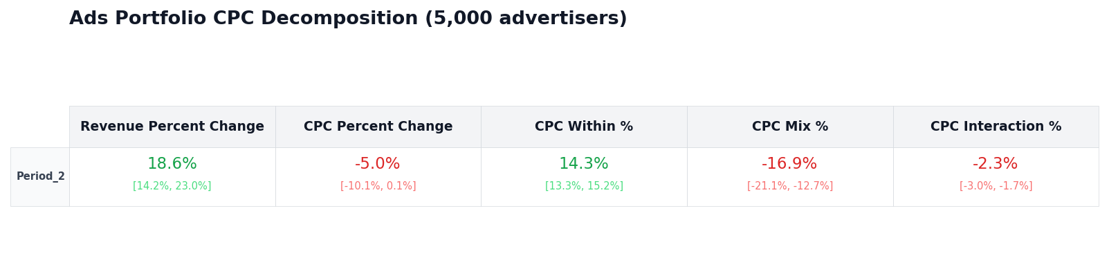 I built a simulation with 5,000 advertisers — Pareto-distributed click volumes, lognormal CPCs, and realistic correlation between volume and cost. Period 2 introduces 15% CPC inflation across the board, but volume simultaneously shifts toward cheaper inventory as bidding algorithms react. Aggregate CPC looks fairly benign. The decomposition shows meaningful within-advertiser inflation being masked by a negative mix effect. That is exactly the kind of result a top-line dashboard can hide. Its also can be simply shown and described from a table: